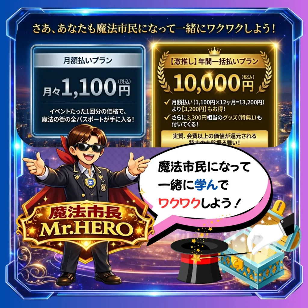 このワクワクと特典が詰まって、魔法市民になる費用はとてもリーズナブル。さらに、3,300円相当のグッズプレゼント付きで、参加した瞬間に会費以上の価値が体験できます。